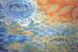 看得见的,是画纸表面的色彩;看不见的是背后许多慈悲菩萨的提携支持,挥汗流泪,念佛回向。背后不疲不厌的奉献者,是真正实践佛陀教义的画佛者,末学只是被慈悲的光明牵引著登上‘椅子叠凳子’的画台罢了,也只是做最表面的工作罢了,真正辛苦吃力的事,都是别人代劳的,我们共同的心愿是想将此献给生命道上一切痛苦的心灵,荆棘路上即使忍不住眼泪,也要望向清净光明的西方!此心,离开了阿弥陀佛,便是纷扰的妄想尘劳;离开了慈悲,将只有哭泣……。世上没有一个人能经常体健又如意,每一个人在生命里都会尝到衰疲不支的滋味,在体力不支时,就得不断鼓起愿力,阿弥陀佛的大愿,点燃我们心中的愿火,而末学—一个忍力没有成就的凡夫,即使每晨诵念著「纵使身止诸苦中,如是愿心永不退’,也会有忍不住眼泪的时刻;然而即使是忍不住眼泪,我心中仍要诵念:‘假使身止诸苦毒中,我行精进,忍终不悔’,敞开胸怀让阿弥陀佛的欢喜光,充满心中。想到无边无际同受苦楚的众生,诚愿大家都回首仰望弥陀慈眸,将痛苦转为一朵朵供养佛陀也普供众生的莲华,把忧恼变成馥郁适意的曼陀罗。体会佛的慈悲,实是一个人生命中最重要的事。