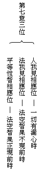 这第七末那的差别,略有三位:(1)人我见相应位,通一切异生相续。二乘有学、七地以前一类菩萨(除二乘无学、回心菩萨)有漏心位,彼第七缘阿赖耶识起补特伽罗我见,即一切有漏心,皆是此位。(2)法我见相应位,通一切异生、声闻、独觉相续(有学无学),及一切菩萨法空智果(法空智即法空无分智,果即法空后得智和法空智引起的灭尽定)不现前时,彼法执心缘异熟识起法我见,皆是此位。(3)平等性智相应位,通一切如来相续。菩萨见道(必证二空故)及修道中法空智果现在前时,彼智缘无垢、异熟识等(一切有为及真如),起平等性智,皆是此位。立表如下(表三):