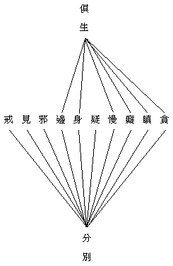 四、独杂分别门:独是此体为支,不与余支相交杂,即名独相。与余支交杂,名为杂相。十二支中,无明、爱、取三支、自体为支,不与余支交杂故。其余九支,皆是杂相:行支及识等五支转名为有支及生老病死故。即有支及生老支亦名为杂,体无异故,用他成故。《成唯识论》说:‘无明爱取说名独相,不与余支相交杂故。余是杂相。’