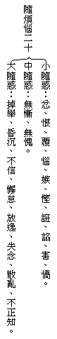 (3)愧:依世间力,轻拒暴恶为性;对治无愧,止息恶行为业。即依于世间的法律、舆论、呵斥、讥毁等的增上力,和自己厌嫌恶染法的增上力,而轻拒暴恶,羞耻过罪,息诸恶行。轻是轻视一切有暴行的人而不去亲他,拒是拒绝一切恶法业而不接近,即不亲暴人,不近恶行,这是性用。由这力量就能够对治无愧,止息恶行,这就是业用。