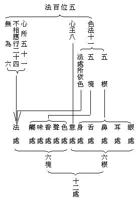 学习佛法的第一个困难,就是为不了解名相的含义所障碍,并且法相名词多以万计,更不容易从各个名相之间得到系统的认识。但是我们假若能够从某些有系统性的名相去学习,而弄清楚其意义和联系性,也很容易克服这一困难。大小乘的论典中,多以心、心所、色、不相应行、无为五位法来作为说明和统摄一切法的规范。如小乘的《俱舍论》以五位七十五法来说明和统摄一切法。(色法十一、心法一、心所有法四十六、不相应行十四、无为法三。)《成实论》以五位八十四法来说明和统摄一切法。(色法十四、心王一、心所四十九、不相应行法十七、无为法三。)大乘法相宗,以五位百法来说明和统摄一切法。这里举出大乘的五位百法来作一简单地介绍,就可以知道佛典中所说的一切法的基本意义和系统了。