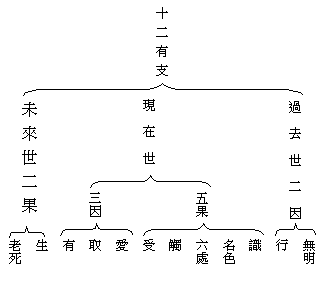 诸经论所说十二有支因果总有五种:一、等起因果,即前前支为因,后后支为果,由前前支势力为因,平等引起后后支得生起故。十二支中无明唯因,老死唯果,其余十支亦因亦果。无明为什么唯是因支呢?因为无明以前再无分支,无所从起,故唯是因支。老死为作么唯是果支呢?约一期相续说,老死无所再起,故唯是果支。其余行等十支,前有所从的因支,后有所起的果支,对前所从的因支,自己是果,对后所起的果支,自己是因,是故亦因亦果。如《瑜伽师地论》第十卷说:‘问:几唯是因,几唯是果?几通因果:答:初一唯因,后一唯果,余通因果。’