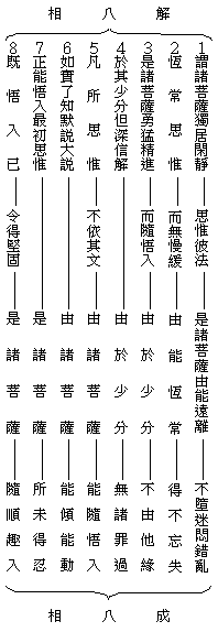 十三、不退:菩萨行者,在认识到守护菩提心的重要意义之后,还必须修学圣教中所说的不退菩提心的方便行来巩固它,才能不会中途退失。《大宝积经》卷一百十一《弥勒菩萨问入法会》说,菩萨成就八法,能不退转大菩提心:一、成就深心。若菩萨听闻他人赞叹佛法僧及毁訾佛法僧,于阿耨多罗三藐三菩提其心坚固不动,是为毕竟成就深心。二、成就行心。若菩萨能毕竟远离杀生、偷盗、邪淫、妄语、恶口、绮语身语清净行,是为毕竟成就行心。三、成就舍心。若菩萨能成施主,施诸有情衣服、饮食、卧具、医药,是为毕竟成就舍心。四、成就善知回向方便心。若菩萨以身语意三业所修一切善根,皆悉回向阿耨多罗三藐三菩提,是为毕竟成就善知回向方便心。五、成就大慈心。若菩萨成就大慈身业、大慈语业、大慈意业,是为毕竟成就大慈心。六、成就大悲心。若菩萨成就不可讥嫌呵责的身业,不可讥嫌的语业,不可讥嫌呵责的意业,是为毕竟成就大悲心。七、成就善知方便。若菩萨善知世俗谛,善知第一义谛,善知二谛,是为毕竟成就善知方便。八、成就般若波罗蜜。若菩萨如是觉知:依于此法有故彼法有,此法生故彼法生,所谓无明缘行、行缘识等,如是唯有大苦聚集的缘起缘生道理;此法无故彼法无,此法灭故彼法灭,所谓无明灭则行灭,行灭则识灭等,如是唯有大苦聚灭的还灭道理:是为毕竟成就般若波罗蜜。经说菩萨成就上述八法,则‘不退阿耨多罗三藐三菩提,于胜进法中不退不转,行菩萨行时,降伏一切诸魔怨敌,如实知一切法自体相,于诸世间心不疲倦,以心不疲倦故不依他智,速疾成就阿耨多罗三藐三菩提。’