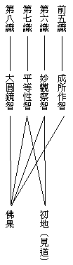 菩萨入见道时,转有漏的第六识,成无漏的妙观察智;转有漏的第七识,成平等性智。到佛果位时,转有漏的前五识,成成所作智;转有漏的第八识,成大圆镜智。四智圆满就是佛果位上具有的四智菩提,立表如表三: