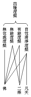 证佛位四智圆满的时候,所证的真如妙理,完全显现,即具得四种涅槃:(一)本来自性清净涅槃,这是说一切诸法的真如实性,虽然是由于客尘烦恼障覆令不显现,但其习性本来清净,不生不灭,其性本寂,故名涅槃。如《成唯识论》说:‘一、本来自性清净涅槃,谓一切法相真如理,虽有客染,而本性净,具无数量微妙功德,无生无灭,湛若虚空,一切有情平等共有,与一切法不一不异,离一切相一切分别,寻思路绝,名言道断,唯真圣自内所证,其性本寂,故名涅槃。’(二)有余依涅槃,即由断烦恼障而显现的真知,但有残余所依的异熟法存在,所以名为有余依涅槃。如《成唯识论》说:‘二、有余依涅槃,谓即真如出烦恼障,虽有微苦所依未灭,而障永寂,故名涅槃。’(三)无余依涅槃,即断尽生死苦而显现的真如,烦恼既尽,残余的所依亦灭,众苦永寂,故名涅槃。如《成唯识论》说:‘三、无余依涅槃,谓即真如出生死苦,烦恼既尽,余依亦灭,众苦永寂,故名涅槃。’(四)无住涅槃,即断尽所知障而显现的真知。证这涅槃时,即生起大悲大智。因有大悲故,不住于寂灭的涅槃,而在三界中利乐众生;有大智故,虽在三界里教化众生,以已脱离迷界故,不为生死所染污、所系缚,用而常寂,故称为无住涅槃。如《成唯识论》说:‘四、无住处涅槃,谓即真如出所知障,大悲般若常所□翼,由斯不住生死涅槃,利乐有情,穷未来际,用而常寂,故名涅槃。’