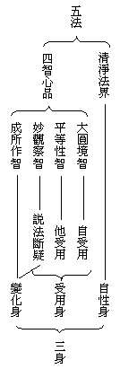 这四种涅槃,总束为清净法界,加前四智,以为五法。这五法就成为佛果位的自性、受用、变化三身。清净法界是自性身(法身)。如《成唯识论》说:‘一、自性身,谓诸如来真净法界,受用、变化平等所依,离相绝然,绝诸戏论,具无边际真常功德,是一切法平等实性。即此自性,亦名法身:大功德法所依止故。’受用身分自受用和他受用,自受用身是大圆镜智所现,恒自受用广大法乐。他受用身是平等性智所现,为十地菩萨现通说法,决众疑网,令他受用大乘法乐。如《成唯识论》说:‘二、受用身,此有二种:(一)自受用,谓诸如来三无数劫,修集无量福慧资粮所起无边真实功德,及极圆净常遍色身,相续湛然,尽未来际,恒自受用广大法乐。(二)他受用,谓诸如来由平等智示现微妙净功德身,居纯净土,为住十地诸菩萨众,现大神通,转正法轮,决众疑网,令彼受用大乘法乐。合此二种,名受用身。’变化身是成所作智所现,为未登地菩萨众,及二乘异生,随类示现化身,称机说法,令各获得诸利乐事。如《成唯识论》说:‘三、变化身,谓诸如来由成事智变现无量随类化身,居净秽上,为未登地诸菩萨众,二乘异生,称彼机宜,现通说法,令各获得诸利乐事。’妙观察智,于大集会中,说法断疑。立表如表五: